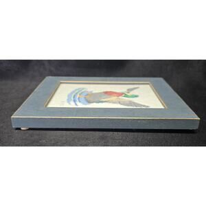 Vintage Mallard Duck Cross Stitched Matted Framed Country Farmhouse Home Decor. Framed in a Wooden Blue House of 10,000 picture frame. The frame does have some color worn off as shown.