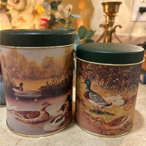 Set of two decorative tins featuring duck illustrations. Perfect for storage or display. Rich colors enhance the design.