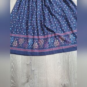 This elegant navy blue floral dress is perfect for any occasion. The intricate pattern adds a touch of sophistication. Ideal for both casual and formal settings. Has a button in the back. no zippers. Shoulder pads. please keep in mind this is a vintage dress so runs smaller than our average 10. Will probably fit best a size 6-8 ( Please See Measurements )