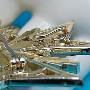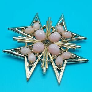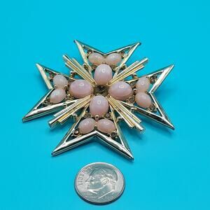 This Vintage Maltese Cross Brooch features pink cabochons and gray rhinestones, with a cross shape design set in a gold color. The brooch is signed "MX233" and showcases a prong setting style. It is a unique and eye-catching piece of vintage jewelry, perfect for women who appreciate classic and timeless styles. A standout accessory for any outfit, this brooch is sure to make a statement with its intricate details and unique design. It may also be worn as a pendant.