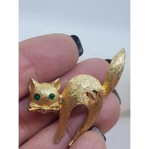 Item: Vintage figural cat brooch/pin with an arched-back feline design and long tail