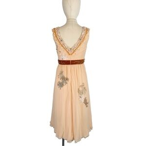 Features: This is a vintage 2007 collection piece. This dress is absolutely stunning. It is perfect for day time with boots or sandals and can transition to a night time date night dress with heels. It is made from 100% double layered silk chiffon. It's v neckline showcases the beautiful placed embellishments on the front and the back. It has a fixed empire embellished waist line that creates a slimming feminine silhouette. The skirt of the dress is flowy and very comfortable as well as breathable. it is sleeveless and can be worn with or without a cute denim jacket. This item is finished with a hidden zip closure.