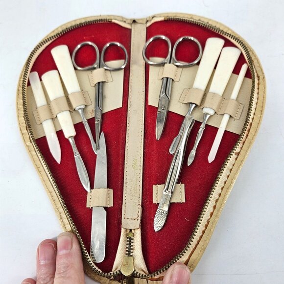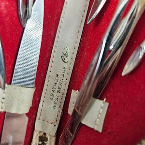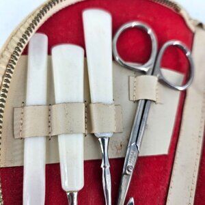 This vintage manicure set encapsulates timeless craftsmanship with its beige leather case, lined in red, and durable tools. A nostalgic piece from West Germany.