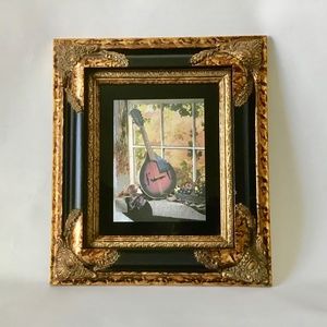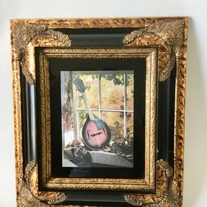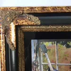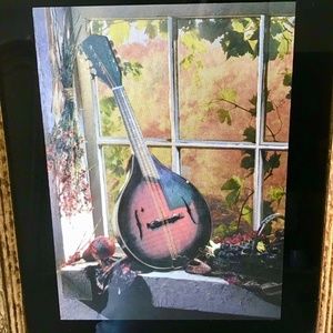 Mandolin musical instrument in the window. Produces varied depths that convey an iridescent effect and the illusion of movement. Subtle changes in light, such as colored lights, firelight, and candle light will have a magical effect on the work of art. Framed and mounted in a black with gold antique detailing. Height is 16 inches by 14 wide. Last picture shows a little dent on the black frame.