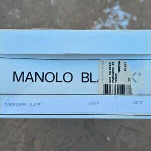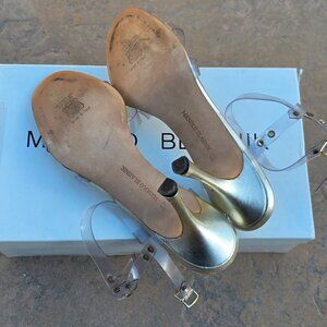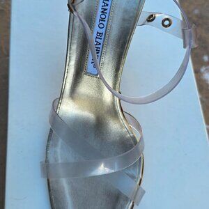 Embrace the height of Y2K fashion with these eye-catching, 100% authentic vintage Manolo Blahnik heels. They are from the mid-to-late 2000's and have the iconic "clear strap," aesthetic that is trending again. These heels combine a shiny golden leather insole with transparent PVC straps that are adjustable to fit from a 7"-10" circumference to fit a variety of ankle sizes. Instead of blending in, they stand out and make a statement while still being subtle. Ideal for going out, parties, or for spicing up a laid-back look with that signature early 2000's look. The pictures make them look more silver then they are in person, they are metallic gold. These are are 15+ year old shoes and are impossible to find in this condition. They come in the original box with the original tissue paper.