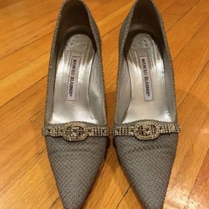 My mother bought these for her wedding almost 20 years ago to match the custom made dress she wore. Please check out the dress by Galit I have listed here on my Poshmark. They are a beautiful silver woven classic style heel with Swarovski across the front. There are 2 small areas on the inside of both shoes where the woven material came off (pictured) Original box included. Very comfortable!