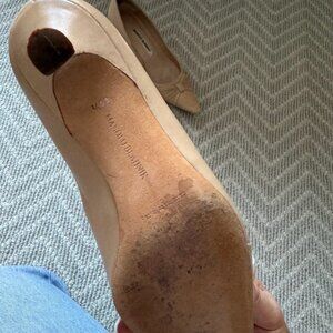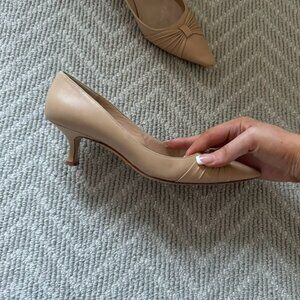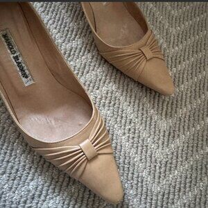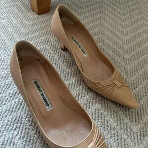 Classic pointed-toe heels by Manolo Blahnik, crafted in Italy from supple tan leather with elegant pleated detailing at the toe and a refined kitten heel. Timeless and versatile—perfect for workwear, minimalist styling, or vintage collectors.