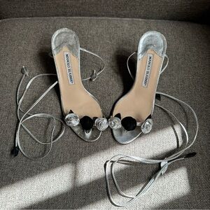 Vintage Manolo Blahnik metallic & black rose sandal heels