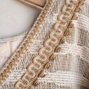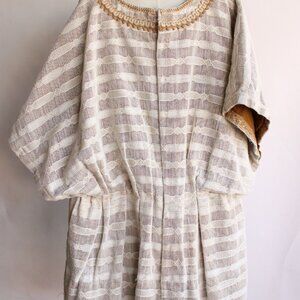 Fantastic vintage man's roman style tunic in white and gold. Worn by actor Richard Keil (I do not know if this is just a misspelled version of Richard Kiel, known for Moonraker and others, or not, but as several of the rest of the costumes in this collection had some known names attached and the size of this is so great, I sort of suspect that's the case). Outer layer is a woven white material and inner layer is a gold twill or similar. Pulls over the head and has a hidden inner back metal zipper and then snaps over that. My best guess as to age of this is circa 80s or 90s using some older materials. This is made for a large man, and is quite heavy, shipping will reflect that. Has one tag that I've found that says Parsons-Meares Ltd ( which is a costume house in NY started in the 80s. Under that is a 2nd tag with Mr. Keil's name. This comes from an enormous collection of Old Hollywood Movie Costumes I was lucky enough to stumble across. More about those later after the measurements so please read on...