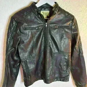 Vintage “leather” jacket made of polyester. Excellent used condition, vintage style bomber jacket. Size medium, but runs a little on the small side.