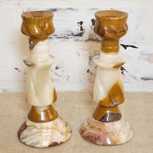 Vintage Marble Candle Holders Brown-Cream-White Made in Mexico Set/2 - 6.5" Tall. Beautiful marbling throughout. Note that there is a couple of chips in the marble on the top of one of the candle holders, but hardly distinguishable because of color. Other has very tiny flea chips. Again, hardly noticeable because of marble color.
