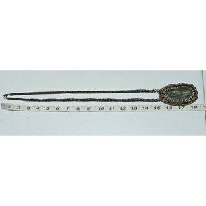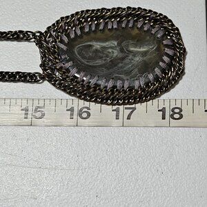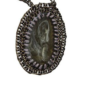 This vintage-inspired necklace features a marbled stone pendant framed by intricate braided chain detailing. Its timeless design complements both formal and casual attire.