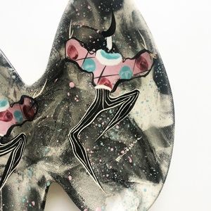 Authentic, preowned, mid century modern vintage Marc Bellaire 'Mardi Gras' candy dish. Colorful two section ceramic dish, perfect for your mid century modern home decor. Vintage (50+ years old) with some signs of use/wear: no chips/cracks but glazing shows some surface scratching, most notable to bottom (pic 7). Measures appx 9.45in at longest x 9in at the widest x 1.95in H.