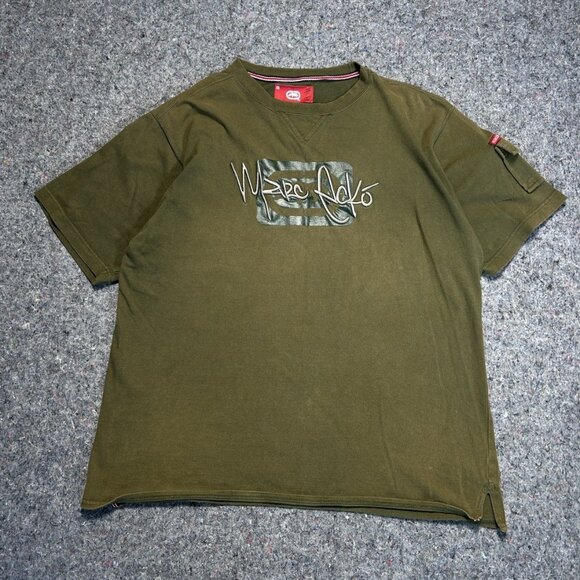 Marc Ecko, Ecko Unltd, vintage 2000, early 2000s, streetwear, hip hop, embroidered tee, rhino logo, military green, size XL, rare, mens tee.