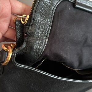 Good condition with minor wear. See photos for details and measurements. Minor scuffing on hardware. No major flaws. Elegant black leather crossbody bag with gold accents. Perfect for any occasion.