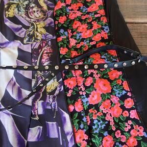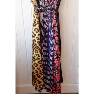 Color: Multi; features purple and black diagonal stripes, leopard print, bright pink floral print, and ornate baroque scarf-inspired motifs on a black base.