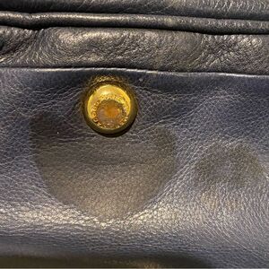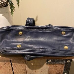 Vintage navy blue satchel/shoulder bag. Buttery soft leather with gold hardware. Pre-loved in good condition. Has a stain at the bottom as seen in pic and small marks on the inside liner. No rips, tears or scratches. Approximate measurements are 16 x 10 x 5. Feel free to ask for additional pics or info.