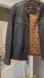 Stylish vintage dark brown leather jacket with a quilted tan lining. Ideal for a modern, sleek look.
