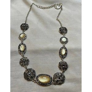 Vintage Marcasite And Yellow Necklace —.(Crown Trifari?). This necklace is in pristine condition. In a Google search an image of this necklace shows a Crown Trifari version. I thought perhaps the Crown Trifari Emblem may have fallen off as does happen with vintage jewelery. It is not "marked" marcasite or silver so I am assuming that they are "faux". The Fifth depicts the necklace with the "Crown Trifari" Jewelry Hang Tag. Measurements: Length: 15"; Extender: 3"