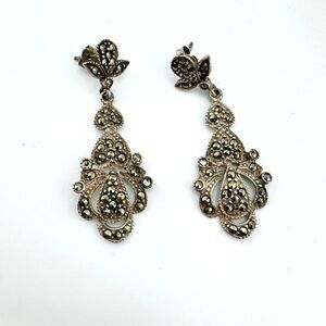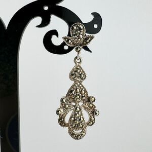 Step back in time with these stunning vintage marcasite dangle earrings. The intricate filigree design & sparkling marcasite stones create a captivating & timeless look. Inspired by the Art Deco era, these earrings are perfect for adding a touch of vintage glamour to any outfit