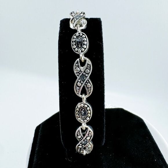 Step back in time with this stunning vintage bracelet, a perfect blend of Art Deco elegance & timeless style. The intricate XOXO design, adorned with sparkling marcasite & clear rhinestones, creates a captivating and eye-catching piece. Perfect for adding a touch of vintage glamour to any outfit.