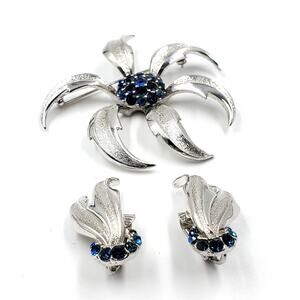 Vintage Marcel Boucher Blue Crystal Starburst Floral Brooch & Earrings Set 1950s