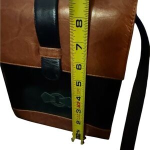Timeless vintage leather crossbody bag by Margaret J. Made in Spain with a genuine leather upper and manmade lining. Features a structured silhouette with a rich two-tone color scheme, a stitched emblem on the front, and a secure flap closure.