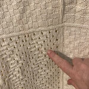 Vintage Margo’s sweater in an ivory/cream tone. Features a unique patchwork knit pattern with alternating open-lace and basket-weave textures, crafted from a soft 55% ramie / 45% cotton blend. Made in Hong Kong—high-quality vintage construction.