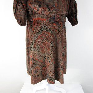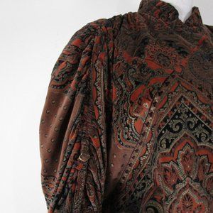 Stunning one of a kind vintage Marguerite Rubel San Francisco women's brown metallic gold orange brocade jacquard velvet skirt set suit in excellent vintage condition. Dry clean only. No material content. Velour velvet. Ruched buckled sleeves. Buckle can be let out. No size tag. My dressform fits a 0 up to a 10. The fit would make this approximately a S or XS. Jacket is very oversized in the shoulders but tighter around the waist. Skirt is A line with a very small waist. Please see measurements for accurate sizing.