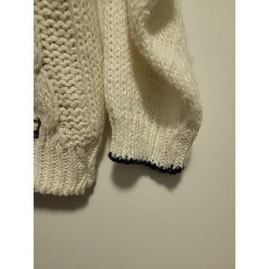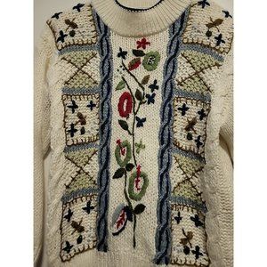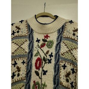 Super cute sweater. Embroidered on front. Mock Neck. White Blue Green Brown Red. Shoulder pads. Chest measures 47" Length 25".
