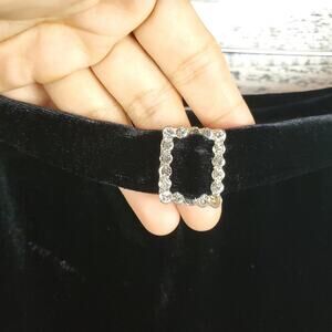 Elegant and timeless black velvet maxi skirt by Maria Gabrielle New York. Features an elastic waistband for comfort and a built-in front belt detail with a sparkling rhinestone accent buckle for added flair.