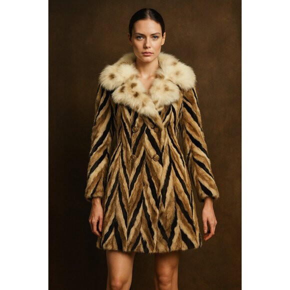 Vintage Marie Enny Real Mink Fur Coat Genuine FoxFur Collar Tiger Stripe Pattern