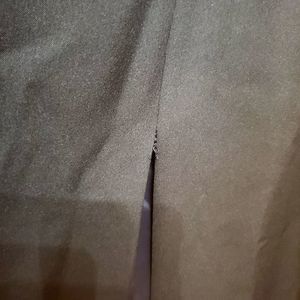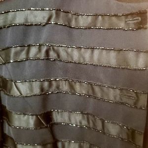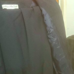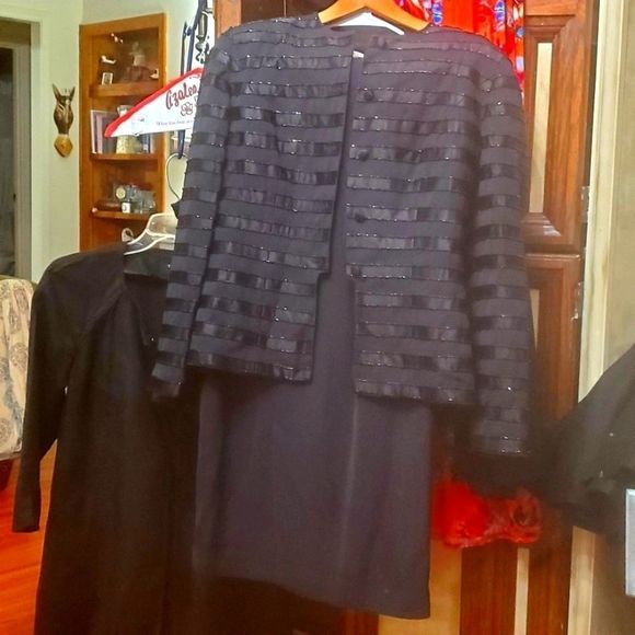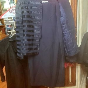 Navy Blue with beaded jacket and matching full length pencil skirt with a risqué slit in the back. The skirt needs a couple stitches above the slit. The jacket has lost one bead since I stored it. Beautiful classic workmanship and design. ST Claire has dressed some big names from the big screens.