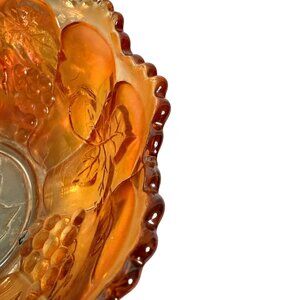 FEATURES: This bowl is made of pressed glass that has an iridescent sheen / orange-gold oil slick color / featuring grapevines and scalloped edges / see photos for more details