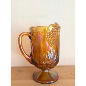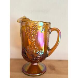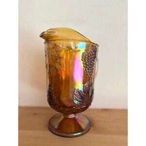 This stunning vintage marigold carnival glass pitcher glows with a warm, iridescent finish that shifts beautifully under light — from amber to gold to rose-purple tones. The design features an embossed grapevine and leaf motif, a classic of early 20th-century pressed glass styles, perfect for collectors or vintage glass lovers.