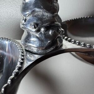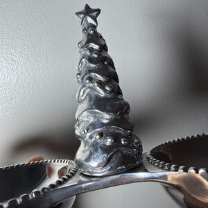 This vintage Mariposa Christmas Tree Double Bowl Serving Dish is perfect for your holiday table setting. Crafted from durable aluminum, it features a stunning design of one ornate Christmas tree that also acts as a holder between two small bowls for snacks on display