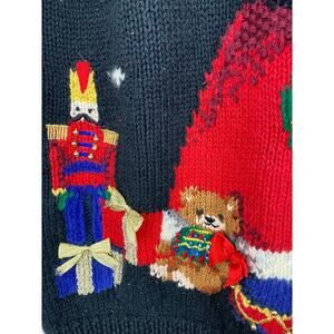 Women, women's shoulder pads, 90s, Santa Claus, holiday, winter, knit, pullover, embellished, red, cream, black, green, gold, pink, gray, blue, ribbon, bow, bows, beaded, bead, beads, bell, bells, soldier, toy, toys, sequin, bear, teddy bears, star, stars, tree, mock neck, ramie, cotton, stretch, size medium.