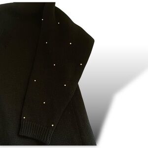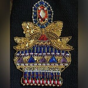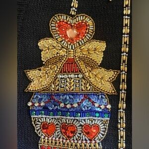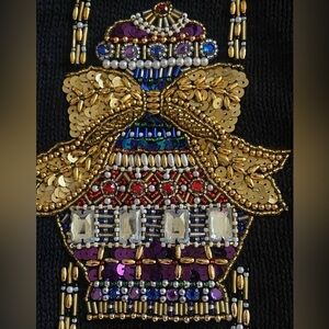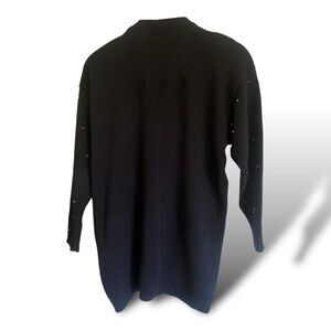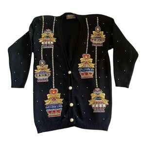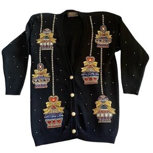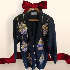Stunning Vintage Black Knit Cardigan Decorated with Sequined Holiday Ornaments *(all intact) V-Neck Front Button adorned with Gold Trim Pearl Buttons. Excellent condition