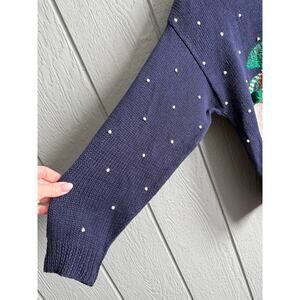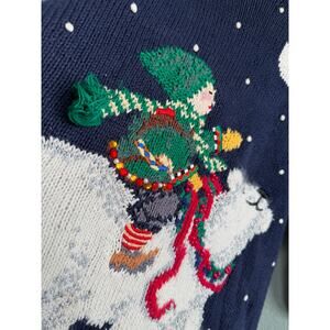 This vintage Marisa Christina Classics sweater designed by Mary Engelbreit features an adorable hand-knit scene of a child riding a polar bear under a night sky. Charming 3D details like the child’s tassel hat, sequins, beads, and textured knit make this a standout holiday or winter sweater.