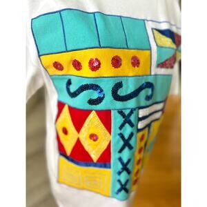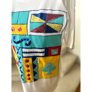 Excellent condition. Very 90s! White base with bright yellows and blues in a nautical themed print with all over sequins. Short sleeves, long line.