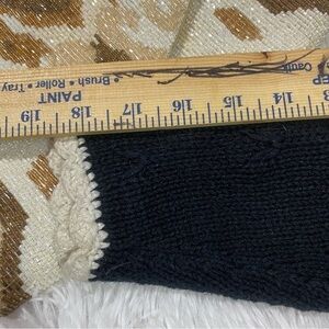 Vintage 90s Marisa Christina black knit ugly Christmas sweater with green Christmas tree and red presents. White scalloped edges of sweater. Great vintage condition