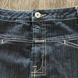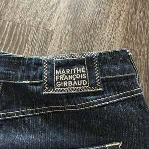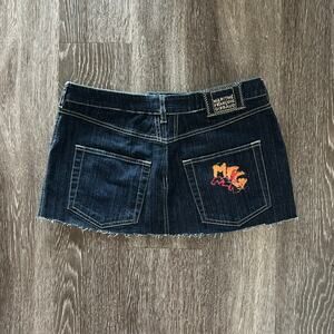 Rare Y2K-era Marithé François Girbaud denim micro mini skirt. Dark wash stretch denim with contrast stitching, raw frayed hem, and distressed logo graphic detailing on the front and back pocket. Classic 5-pocket style with zip fly and button closure. Iconic early-2000s MFG streetwear piece, highly collectible
