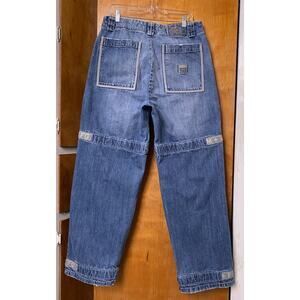Killer 90s/00s shuttle tape jeans in medium blue wirn gray logo and trim details. Baggy fit, lots of pockets, reinforced stitch knees.
