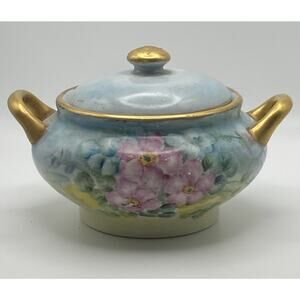 Vintage Marked Pastel Floral Gold Trim Sugar Bowl w Lid Violets Trinket Box READ