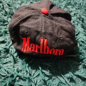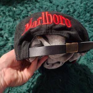 Step back into the bold ’90s with this authentic Marlboro Adventure Team “Snake Pass” hat. Features a striking embroidered snake graphic on the black crown with vibrant colors, crisp red bill, and classic red top button. Iconic Marlboro logo embroidered on the back and Adventure Team patch on the side. Adjustable leather strap with brass buckle ensures a perfect fit for most head sizes.