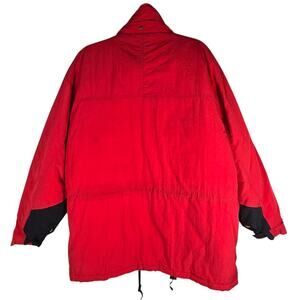 Item: Insulated jacket/parka with red nylon shell and black quilted lining; adult Mens Large