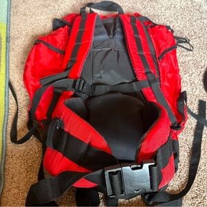 Huge Marlboro Adventure Team XL camping and hiking backpack that comes with a detachable day backpack. Material is nylon. It’s very durable and has many zippered compartments with drawstring top closure. 30” x 20” approximately