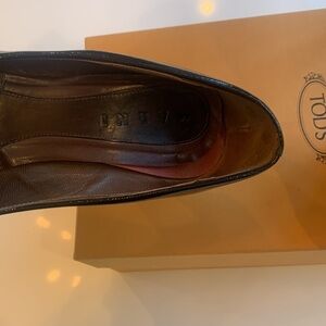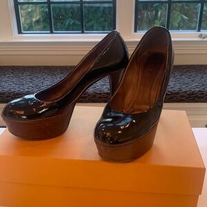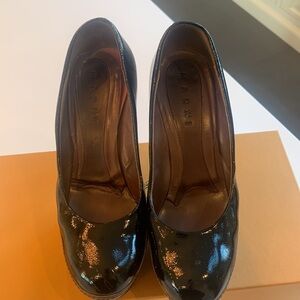 MARNI pumps in black patent leather with a round toe, brown leather covered platform, and stacked stiletto heel. Made in Italy.