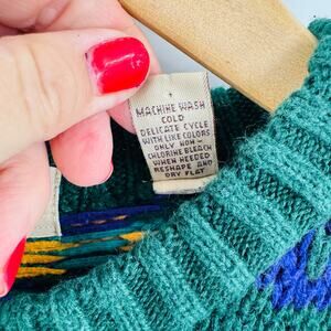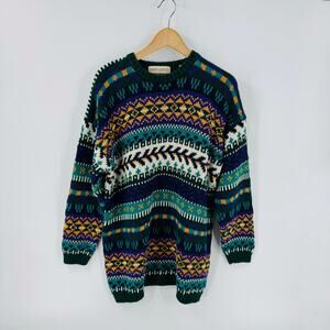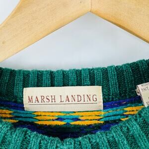 Authentic vintage Marsh Landing sweater featuring a bold multicolor geometric knit pattern in shades of green, navy, teal, mustard, and cream. Classic crewneck with ribbed cuffs and hem. Cozy and timeless, perfect for layering on chilly days or styling as a statement piece. Made for a relaxed, oversized fit. Women’s or Men’s Size Large.