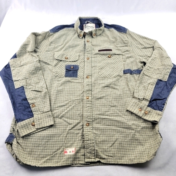Vintage Marshall Artist Modern tailoring 2001 plaid denim and leather button down shirt